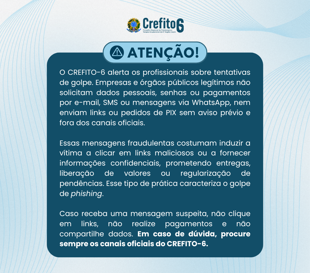 INFORME! O CREFITO-6 alerta os profissionais sobre tentativas de golpe. Empresas e órgãos públicos legítimos não solicitam dados pessoais, senhas ou pagamentos por e-mail, SMS ou mensagens via WhatsApp, nem enviam links ou pedidos de PIX sem aviso prévio e fora dos canais oficiais. Essas mensagens fraudulentas costumam induzir a vítima a clicar em links […]