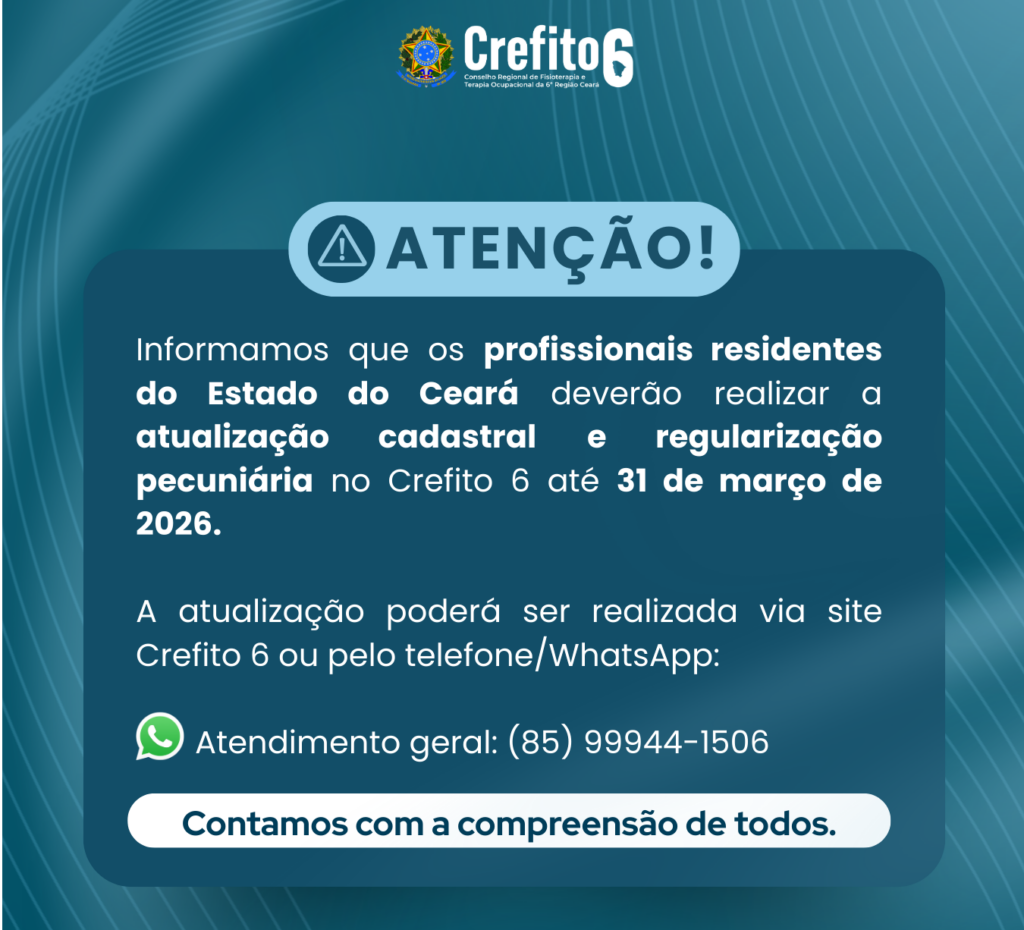 CREFITO-6 convoca Profissionais do Ceará para Campanha de Atualização Cadastral O CREFITO-6 iniciou uma importante mobilização voltada a todos os Fisioterapeutas e Terapeutas Ocupacionais do Ceará. O objetivo é incentivar a atualização de dados essenciais, como e-mail, telefone e endereço residencial e comercial. Por que atualizar? Manter seus dados em dia é mais do que […]